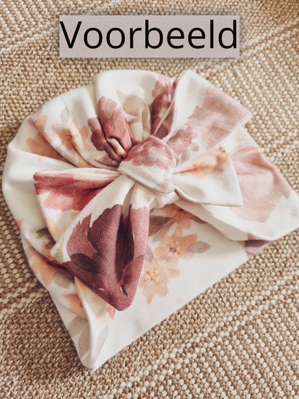 Schattige turban newborn mutsje met strikje.Het mutsje is van recbare ribtricot gemaakt.Dit lievemutsje maakt de outfit van jou kleintje helemaal af.
