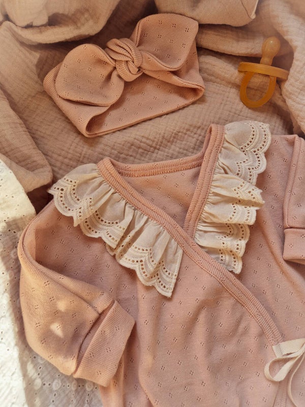 Zachte haarband van ajour.De haarband kun je zelf op het hoofdje van je kleine aanpassen.