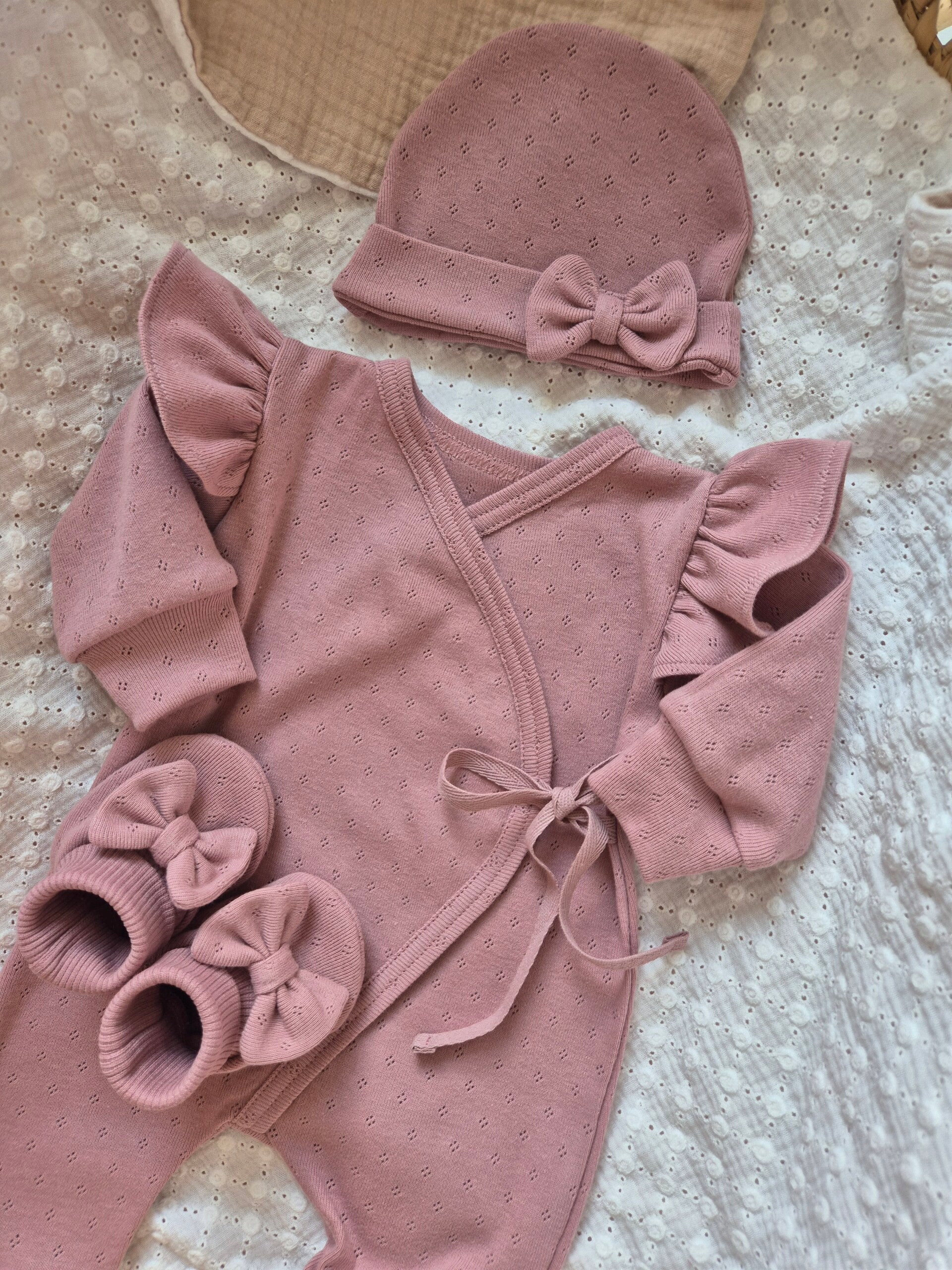 Combineer het pakje met bijpassende mutsje ,haarband of slofjes en maak het geboortesetje compleet.