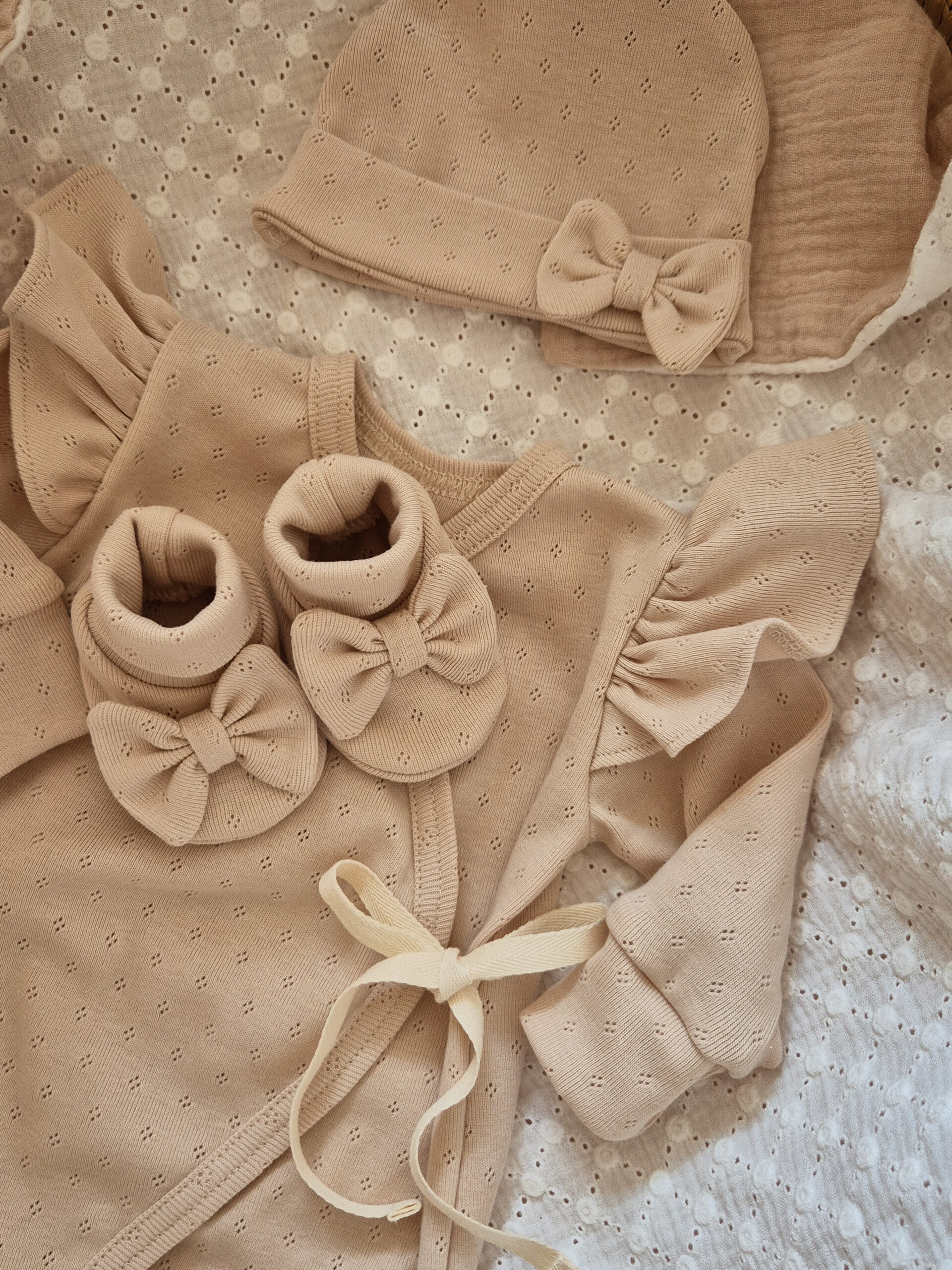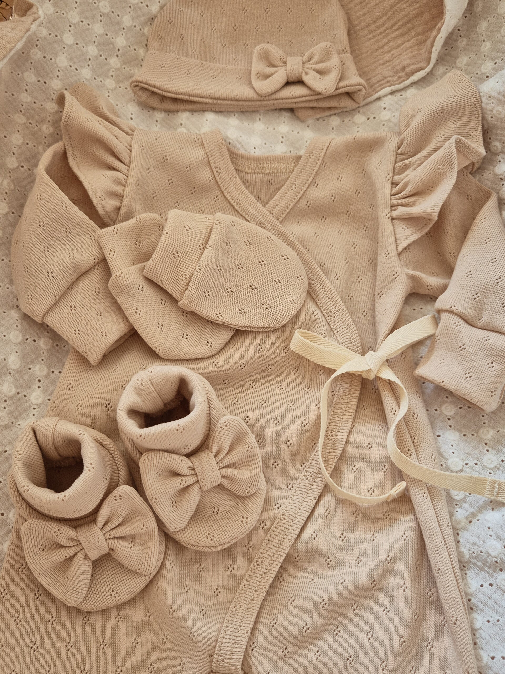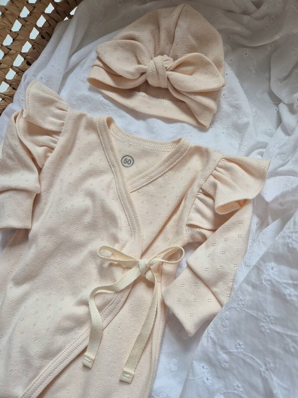 Met liefde handgemaakt,dit stijlvolle overslagpoxpakje in een warm beige tint is perfect voor pasgeboren baby's.