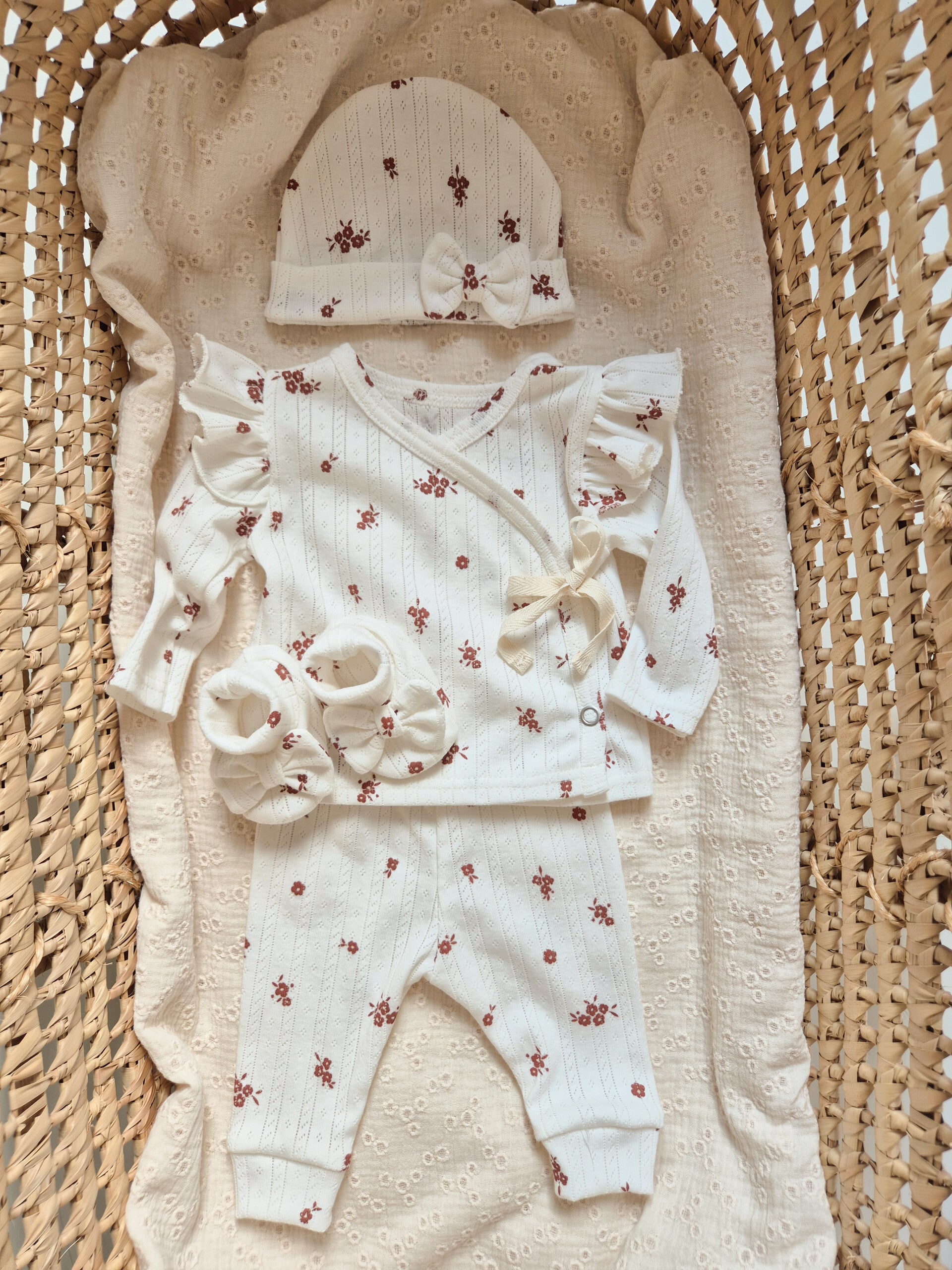 Gemaakt van zacht en ademend ajour pointelle katoen, met een romantische bloemetjesprint en schattige ruffle mouwtjes.