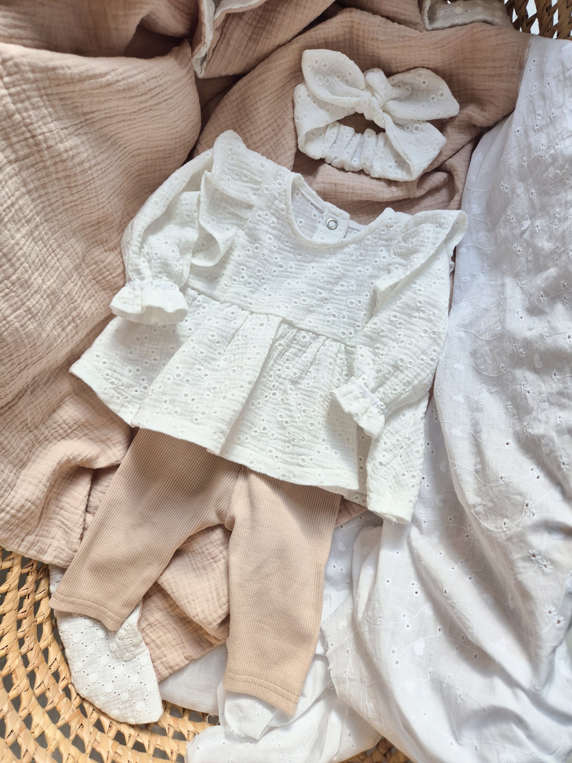 Het is gemaakt van luchtige, zachte hydrofielstof met een sierlijke broderie-afwerking. Dankzij de ruffel en pofmouwtjes krijgt het blouseje een romantische en tijdloze uitstraling.