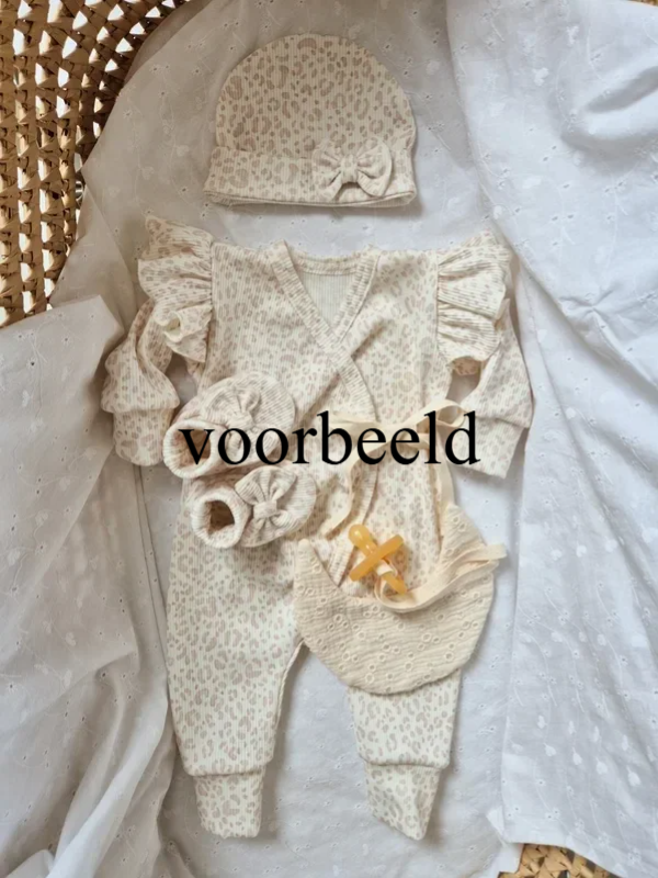 Combineer dit overslagboxpakje met onze bijpassende mutsjes, slofjes, haarbandjes of speenkoorden voor een complete, stijlvolle babylook. Perfect als kraamcadeau of eerste outfit voor jouw kleintje.