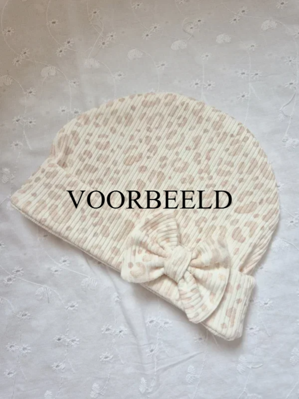 Mutjse van zachte ribstof met strikje.Doordat de boord van het mutsje naar buitenkant omgevouwd is, zitten alle naden verstopt en irritieren ze de huid van het hofdje van de baby niet.
