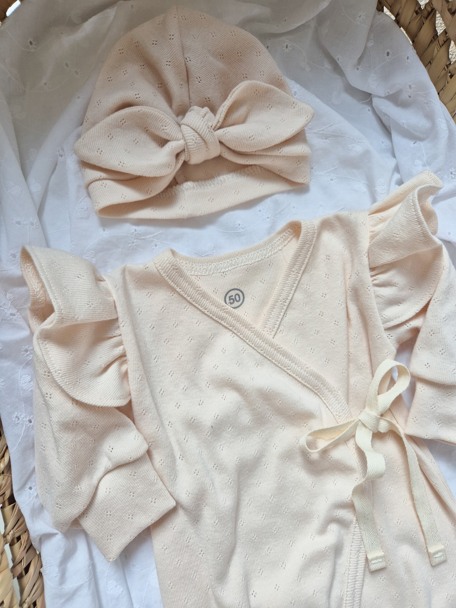 Geef je baby een unieke en stijlvolle look met dit handgemaakte turbanmutsje met knoop. Het mutsje is gemaakt van zachte 100% katoen pointelle, waardoor het perfect aansluit op het hoofdje van je newborn en heerlijk comfortabel zit.