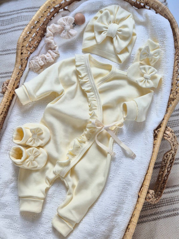 Deze handgemaakte geboortemutsje turban met strik is een stijlvolle en comfortabele babymuts voor pasgeboren baby’s.